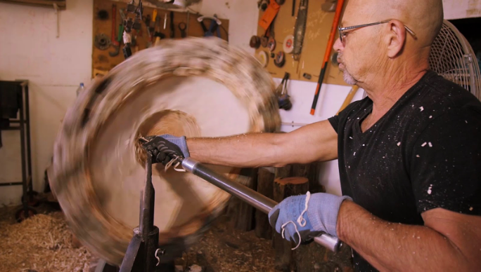 Each sculpture begins with a carefully selected log, mounted on the lathe and shaped with precision using a traditional chisel.